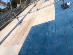 コンパネ(構造用合板)の増し張りは、新しい屋根材を固定するための強固な土台を作るために欠かせない作業です。実際の施工現場写真を確認すると、青く劣化した古い屋根材の上に、新しい木の板であるコンパネが隙間なく丁寧に張り付けられている様子が分かります。私は以前、倉敷市児島のお客様から「風が強い日に屋根が鳴る」というご相談をいただきましたが、点検すると古い下地が痩せて釘が効かなくなっていました。そこでこのコンパネ増し張りを行った結果、屋根全体の剛性が高まり、お客様からも「家全体がどっしりとして安心感が出た」と大変喜ばれた経験があります。