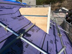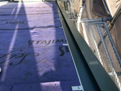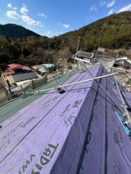 コンパネで平滑かつ強固な土台を作った後は、雨水の浸入を完全にシャットアウトするための「ルーフィング(防水シート)」を新設します。屋根修理において、最終的に雨漏りを防いでいるのは表面の屋根材ではなく、この下にあるルーフィングです。写真に見える紫色のシートが最新のルーフィングであり、これを軒先から棟に向かって適切な重なり幅を持って敷き詰めていきます。倉敷市は日照時間が長く夏場の屋根は80℃近い高温になりますが、今回使用したルーフィングは熱による劣化にも強く、長期間にわたって防水性能を維持します。