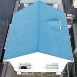 完成後の屋根を全景で確認すると、均一に並んだ屋根のラインが非常に美しく、街並みにも見事に調和しています。今回の屋根修理では、ドローンを使用して上空からも施工ミスがないか徹底的にチェックを行いました。横暖ルーフの表面は特殊な遮熱塗装が施されているため、色あせにも強く、これから20年、30年と美しい外観を保ち続けます。施主様からも「想像以上の仕上がりで、やねドックにお願いして本当に良かった」という最高の評価をいただくことができました。